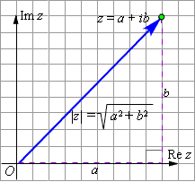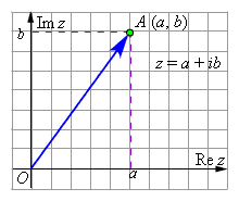 с координатами (a; b)  на комплексной плоскости с началом в точке O (0; 0) и концом в точке A с координатами (a; b). Ясно, что это соответствие является взаимнооднозначным. В самом деле, как было только что отмечено, любому комплексному числу z = a + ib соответствует вектор  и наоборот, каждому вектору