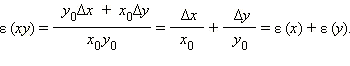 Пусть x = x0 ± Δx, y = y0 ± Δy. Тогда x · y = (x0 ± Δx)(y0 ± Δy) = y0 · x0 ± y0Δx ± x0Δy ± ΔxΔy.