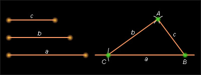 Построение. С помощью линейки проведем произвольную прямую и отметим на ней произвольную точку B. Раствором циркуля, равным a, описываем окружность с центром в точке B и радиусом a. Пусть C – точка ее пересечения с прямой. Далее описываем окружность с центром в точке B радиуса c и с центром в точке C радиуса b. Пусть A – точка пересечения построенных окружностей. Треугольник ABC – искомый.